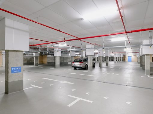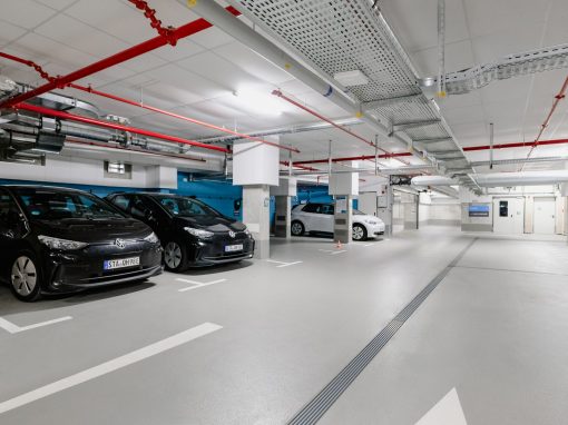 Neben hochwertigen Wohnungen und Gewerbeflächen ist in dem Neubau auch eine Tiefgarage integriert. Die Parkplätze können sowohl temporär als auch dauerhaft gemietet werden und stehen den Bewohnern und Besuchern 24/7 zu Verfügung.